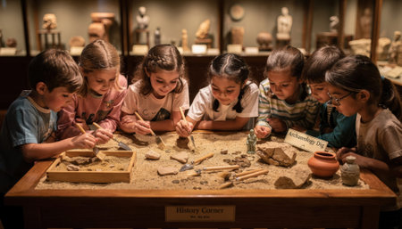 History corner with miniature archaeological dig site props and replica artifacts childrens focused curiosity captured amid blurred surrounding exhibits.