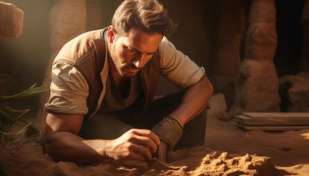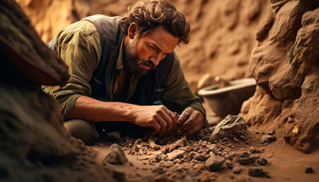 An archaeologist is meticulously studying ancient fossils within a rich and historically significant excavation site. Generative AI