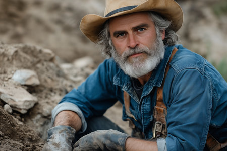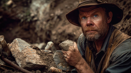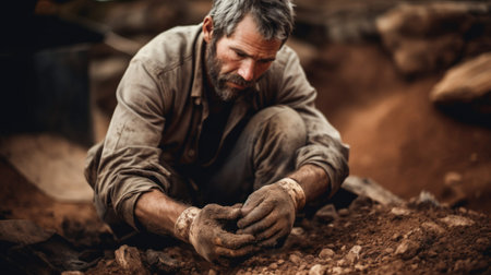 Anthropologist at dig site with dusty hands and tools