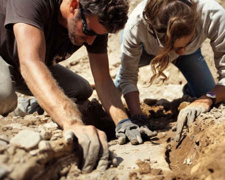 Enthusiastic archaeologists working together, examining soil and artifacts in a sunny excavation site, showcasing teamwork and discovery.
