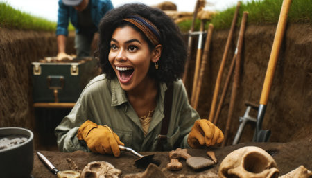 photorealistic image of a female African American archaeologist at an excavation site, showing a mixture of excitement and focus.