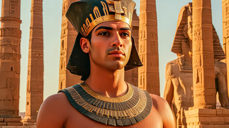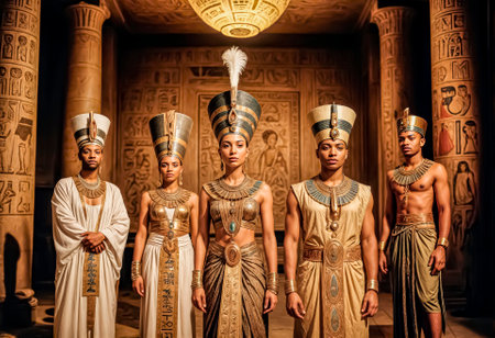 Majestic pharaoh stands proudly in a decorated temple, flanked by members of his court, showcasing the splendor and power of ancient Egypt