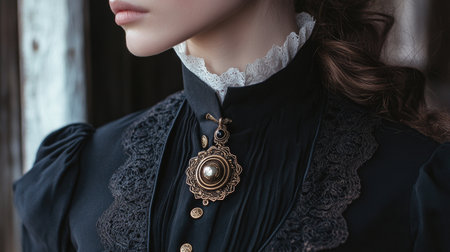 An exquisite close-up capturing the elegance of Victorian fashion, showcasing intricate lace detailing and a beautiful antique accessory, set in soft natural light.