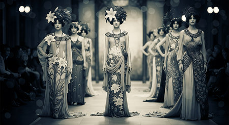 This image features a collection of captivating photographs showcasing women dressed in exquisite evening gowns, Historical fashion evolution from the 1900s to now, AI Generated