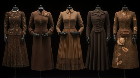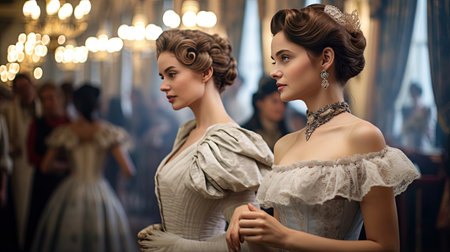 Models dressed in exquisite 19th-century attire pose gracefully in an elegant indoor space, showcasing intricate fabrics, accessories, and vintage hairstyles, highlighting a refined aesthetic.