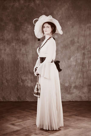 Nice secession style lady posing in ancient apparel and hat on background in studio for figure portraits