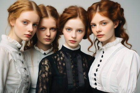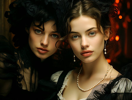 women are elegantly styled in vintage-inspired attire, showcasing timeless beauty and fashion.