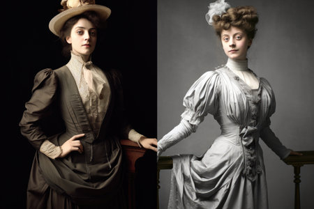 Two women, one in a dress and the other in a hat, walking side by side in an outdoor setting, Historical fashion evolution from the 1900s to now, AI Generated