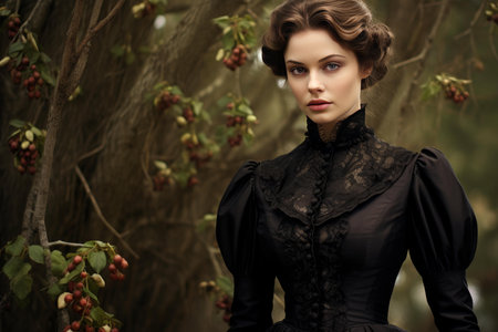 Stunning reenactment of a Victorian lady in a vintage dress. Exuding elegance and sophistication. Amidst the lush greenery and foliage of a garden in the 19th century