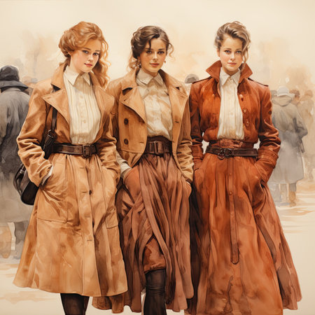 An AI generated illustration of Three young women wearing vintage-style outfits stand together in a row