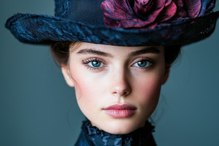 A captivating portrait of a young woman in vintage fashion, adorned with elegant flowers, showcasing beauty and artistry in nature.