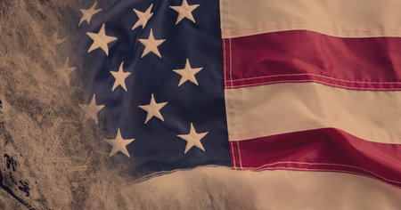 Composition of distressed scratches over vintage, aged american flag. patriotism, independence and celebration concept digitally generated image.