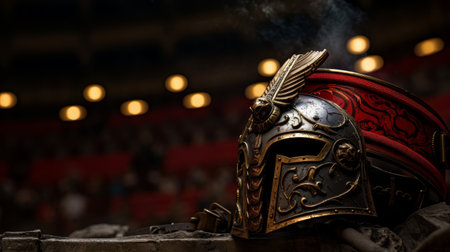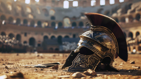 Ancient Roman gladiator helmet on the ground in a coliseum arena with blurred background. Historical reenactment, Roman Empire, gladiators, ancient history, historical warfare, museum display.