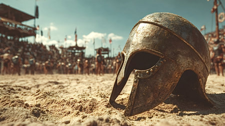 Ancient roman gladiator helmet lying on the sandy ground of an arena, abandoned after a fierce battle with crowds of spectators watching in the background, signifying defeat or an end to the fight