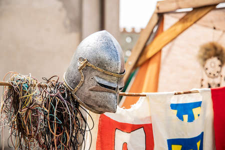 Iron helmet of medieval knight, close up.