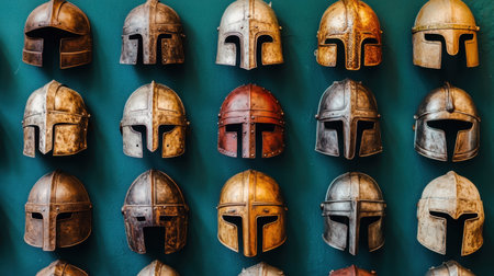 This image features a striking collection of vintage armor helmets arranged neatly on a green wall, highlighting their unique craftsmanship and historical significance.