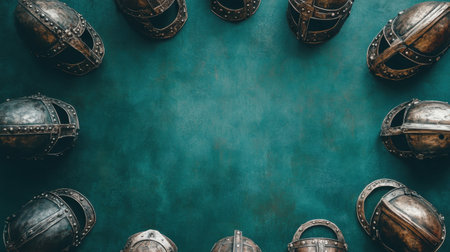 A stunning display of vintage Viking helmets arranged in a circular pattern on a vibrant turquoise background, perfect for historical and fantasy themes.