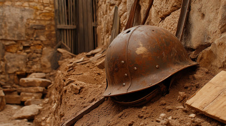 A gritty image of a rusty military helmet partially buried in the earth, capturing the essence of history and conflict in a battlefield setting.