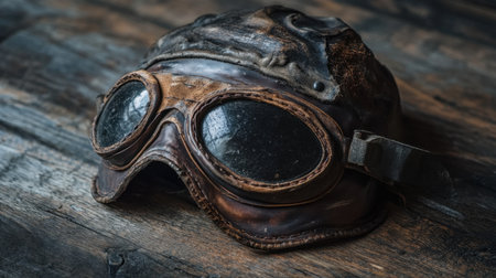 This image features a pair of vintage leather pilot goggles resting on an old wooden surface, capturing a sense of adventure and nostalgia.
