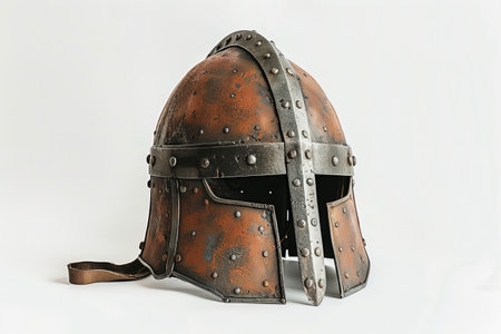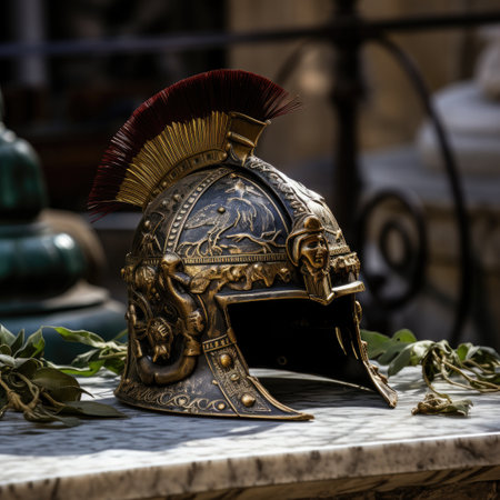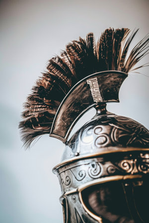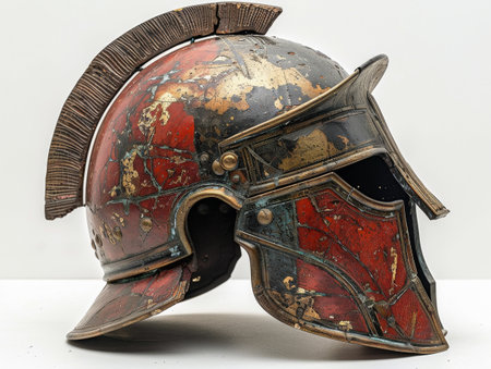 Close up view of an ancient greek helmet, highlighting its intricate details and the weight of history it carries