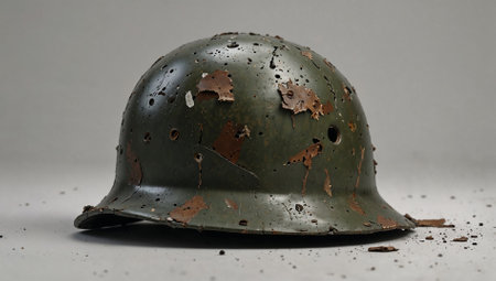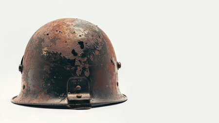 A cracked and weathered soldier's helmet on white background. Representing the fragility of war. War and conflict concept. Copy space.