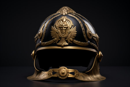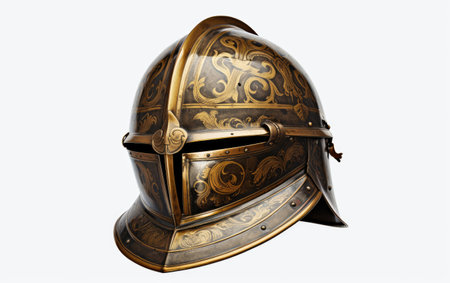Majestic vintage helmet with intricate gold detailing, isolated on a dark backdrop