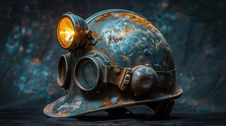 Mining helmet with integrated lamp, showing rugged construction and dust accumulation in crevices
