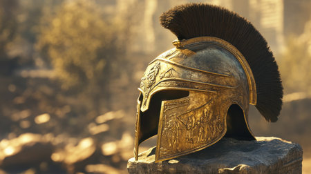 A golden Greek helmet sits on a stone, evoking images of ancient battles and Spartan warriors. Its intricate details speak of history and glory.