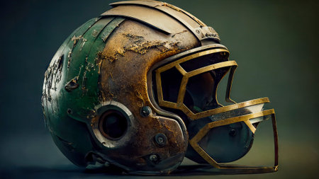 Capture the essence of vintage sports with this classic football helmet and leather ball on a rustic wood backdrop, perfect for nostalgic themes.