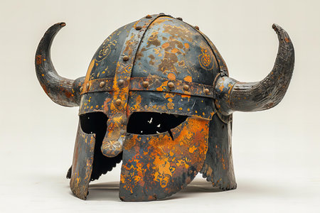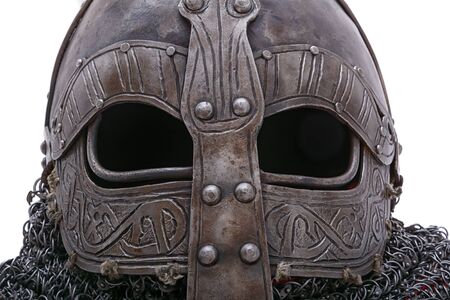 Viking helmet with spikes on a white background, close-up