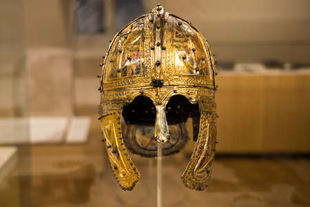 Leiden, The Netherlands - DEC 04, 2020: an ancient gilded silver equestrian helmet from a roman soldier. The helm is found in the Dutch city Peel on 1910.