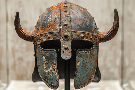 A striking Viking horned helmet resting on a rugged surface, captured against a dark, rustic background, showcasing ancient craftsmanship and historical significance.