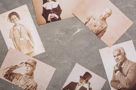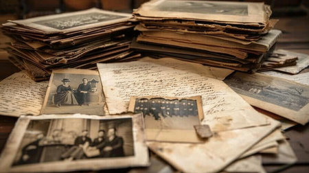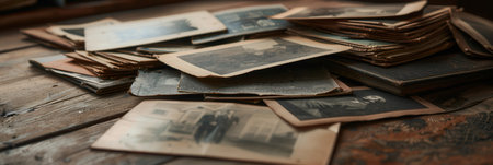 Old vintage photographs laid scattered on a rustic table, creating a warm and nostalgic atmosphere ideal for antique enthusiasts.