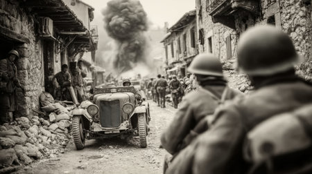 Historical depiction of World War II conflict with soldiers and smoke in a village.