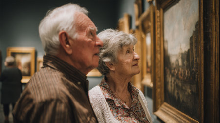 A couple admires beautiful artwork in a quiet gallery reflecting on their shared experiences.