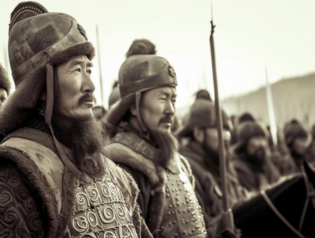 Group of men dressed in traditional clothes standing in a field and looking at map