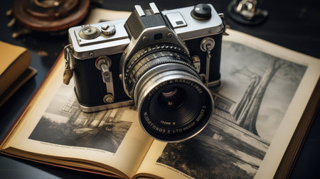 A close-up of a vintage camera on a wooden table, surrounded by antique photographs and papers, capturing the essence of nostalgia and history.