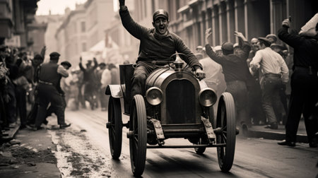 A triumphant image of a winning driver celebrating their victory as they cruise down a city street.