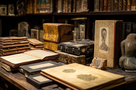 Old vintage photos on an antique table, surrounded by books, evoke nostalgia and timelessness for antique lovers.