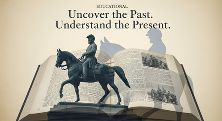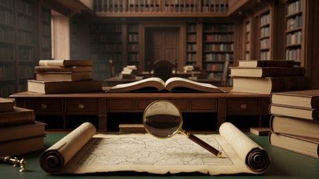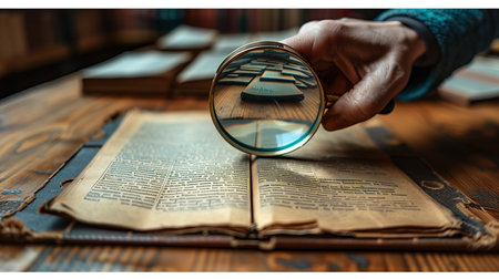 A vintage magnifying glass resting on an open, aged book in a library setting. The image evokes themes of history, research, and knowledge, perfect for educational, antique, or literary concepts.