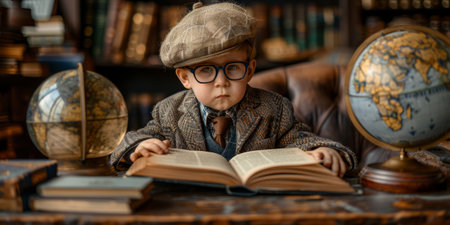 Portrait of a little boy in a hat and glasses reading a book.