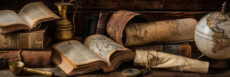 A collection of ancient books, scrolls, and artifacts lies scattered on a rustic table, revealing the rich history captured within.