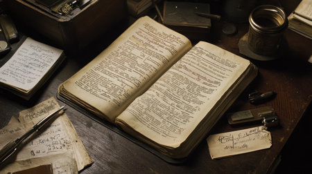 This vintage open book features handwritten notes and diagrams, reflecting a rich history of knowledge. Perfect for education and creativity themes.