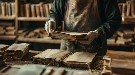A bookbinding workshop where artisans create new books with ancient techniques, symbolizing the blending of old and new