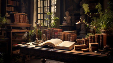 Classic library setting with an artistic bust sculpture next to old vintage books. Represents history, education, and intellectualism in a scholarly environment.
