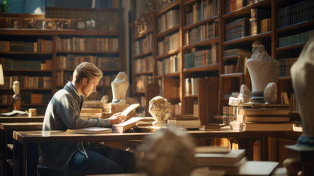A man is sitting at a desk in a library, AI