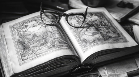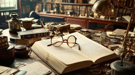 A cozy vintage study featuring an open book and reading glasses atop a wooden desk. The warm light and antique decorations create a scholarly atmosphere perfect for inspiring creativity and learning.