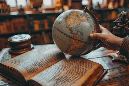 A globe is positioned on a table beside a pile of books, embodying elements of the world, reading, and knowledge through this visual composition