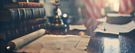 An old, leather-bound book open on an antique desk, with a quill pen and ink bottle adding to the vintage feel.