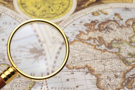 elevated view magnifying glass old vintage map. High quality photo